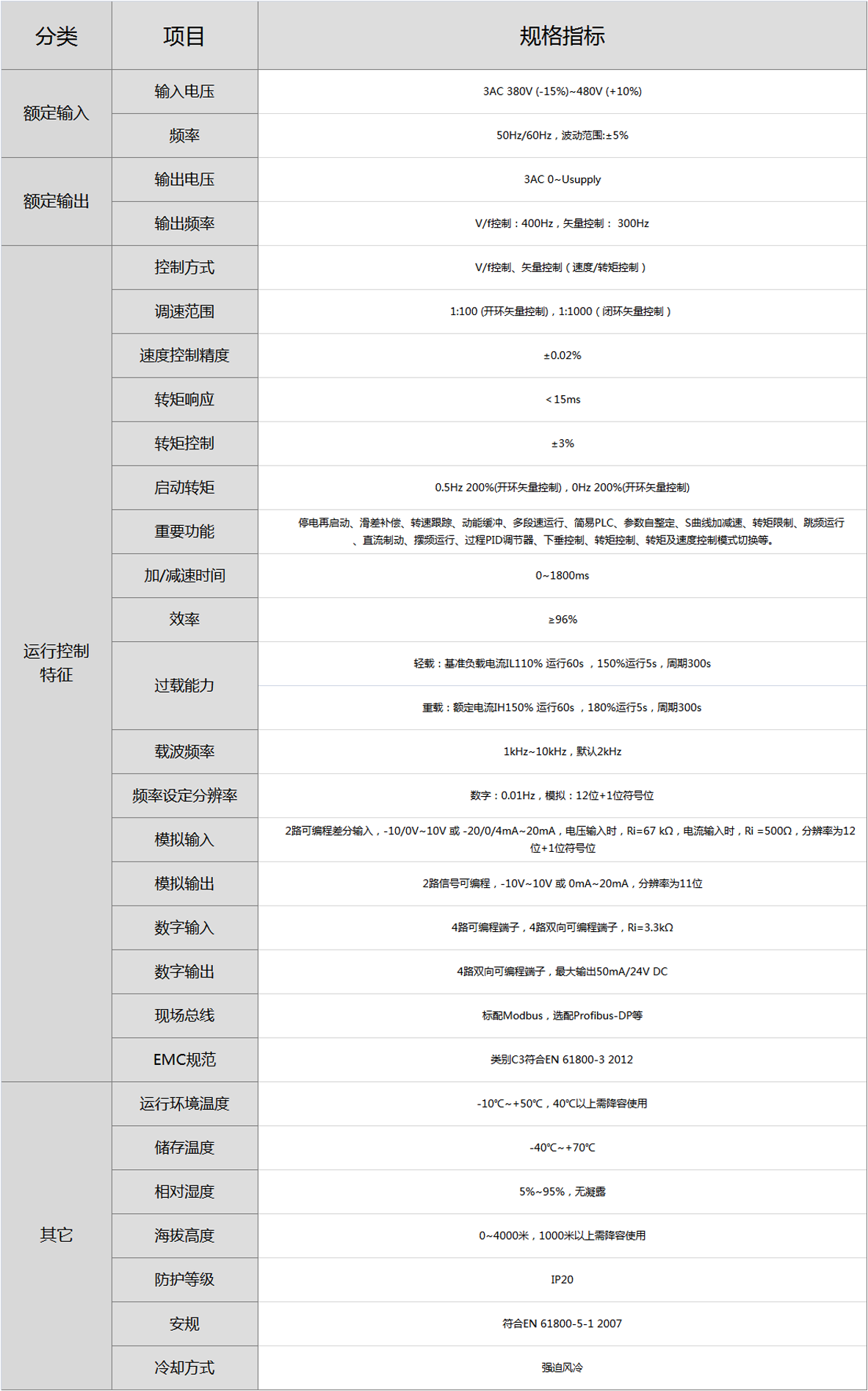1. 无速度传感器矢量控制、VF控制。2. 可通过操作面板快速调试,简单,便捷。3. 循环软启动,可控制多台电机的分级启动和调速控制,降低设备成本。4. 转速跟踪再启动。 5. 变频器内置PID调节器,可实现简单的过程控制。6. 加、减速斜坡函数时间可任意设定,并在起始段及末段可设定平滑功能。 7. 旁路功能,可在变频器故障时自动切换为工频模式。8. 停电再启动,供电恢复后,变频器可自动平滑启动。9. 标配MODBUS通讯板,可与PLC实现低成本集中控制。