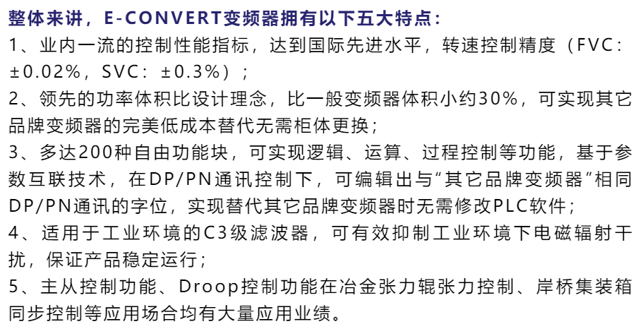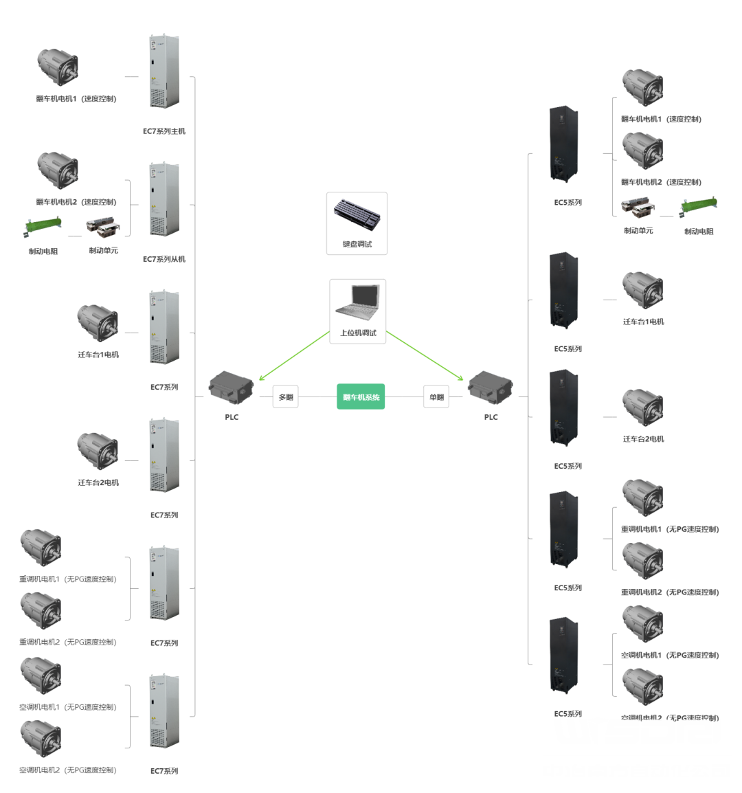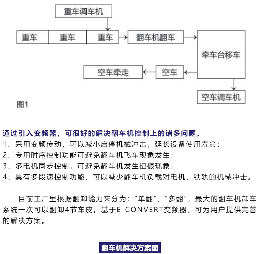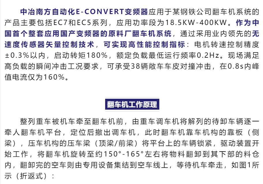 中冶南方自动化E-CONVERT变频器应用于某钢铁公司翻车机系统的产品主要包括EC7和EC5系列,应用功率段为18.5KW-400KW。作为中国首个整套应用国产变频器的原料厂翻车机系统,通过采用业内领先的无速度传感器矢量控制技术,可实现高性能控制指标:电机转速控制精度±0.3%以内,启动转矩180%,额定负载最低运行频率0.2Hz。现场满足高负载的瞬间冲击工况要求,可承受38辆敞车车皮对撞冲击,在0.8s内峰值电流仅为160%。